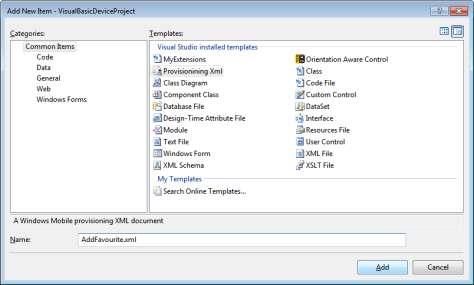 In the last post we saw the new My Extensions template which adds access to new Visual Basic features. In this post we will look at another new item introduced with Mobile In The Hand 4.0 – Provisioning XML. Visual Studio has a rich XML Editor built in, Windows Mobile uses provisioning XML documents for everything from adding a browser favourite through to configuring a new GPRS network. The new template allows you to quickly create an empty Provisioning XML document and includes the schema to ensure your document is valid. Let Visual Studio’s Intellisense help you quickly build a provisioning document. As with the Visual Basic example you start with an existing device project, in this case it can be either C# or Visual Basic. Select Add New Item and choose Provisioning XML from the list:-
