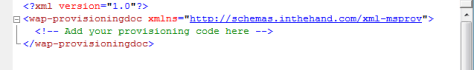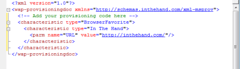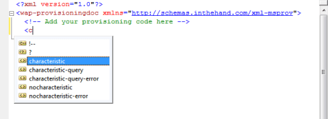 You can now add the required code between the wap-provisioningdoc tags. As you start to type the IntelliSense will suggest valid elements for you based on the schema:-