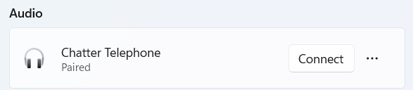 After this the HF will send you “AT+IPHONEACCEV” containing key/values depending on which notifications you showed support for. You’ll need to parse this to find the value corresponding to the key 1 and this is a digit between 0 and 9 which give you the battery level of the hands free device to the nearest 10%. There is a helper method in the sample code which shows how to get this. This isn’t as accurate as the Bluetooth LE Battery Level service we looked at before but most handsfree devices use this method. Annoyingly, although Windows has an API for working with hands-free it doesn’t expose the battery level of devices even though you can see through the Windows Settings app that it knows. You can see from the screenshot above that my Chatter Telephone is at 70% battery.