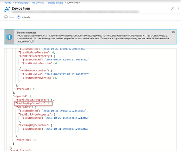 The secondary use for the sensor is to report the occupied status of the parking spot to a cloud service. For simplicity, we will define this as when in amber or red states, because this indicates there is a car currently parked or manoeuvring in the space. This value will be sent to IoT Hub as a device twin property.