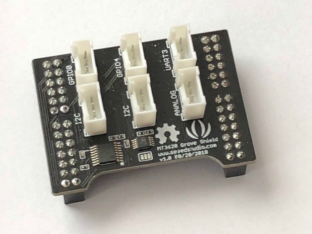 The shield has six Grove compatible connectors with two GPIO ports, two I2C, one analogue, and one serial UART. It has a small cut-out section to provide access to the buttons on the MT3620 board, which helps with orienting it when assembling.