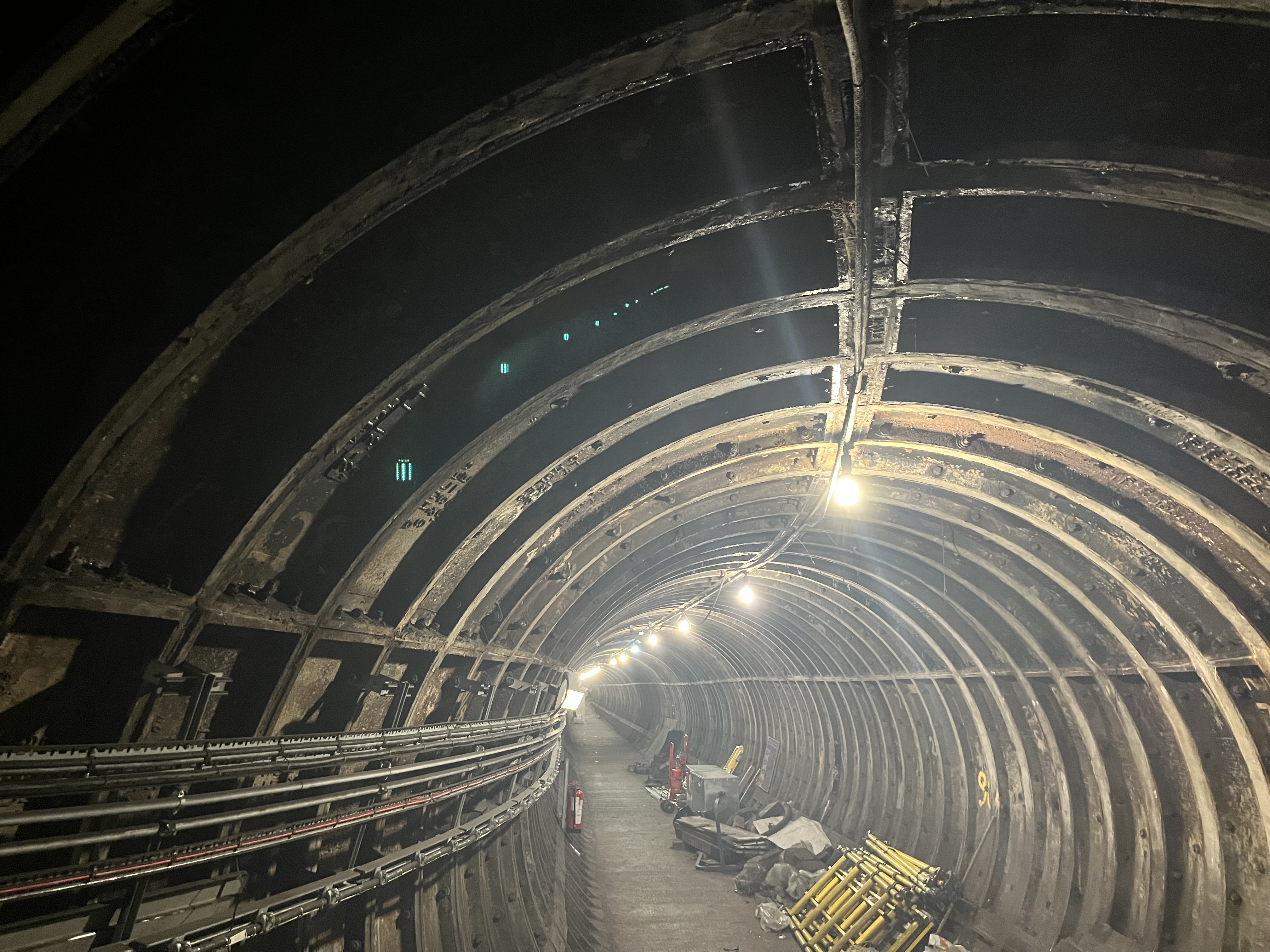 The next stop was to a different part of the station to see how the Jubilee Line was built. There is a long construction tunnel which runs all the way under Trafalgar Square to the construction site which is now the Sainsbury Wing of the National Gallery. Spoil from the tunnels was transported via carts and extracted from here – enough to fill hundreds of Olympic sized swimming pools. Because of the proximity to the foundations for Nelson’s Column the tunnel had to be built in a curve so as not to cause any movement. We were shown how many of the metal panels lining the tunnel were left over from the Victoria Line which was built in the previous decade. None of these underground spaces go unused, and the tunnel is now used to store spare equipment and material for making repairs.